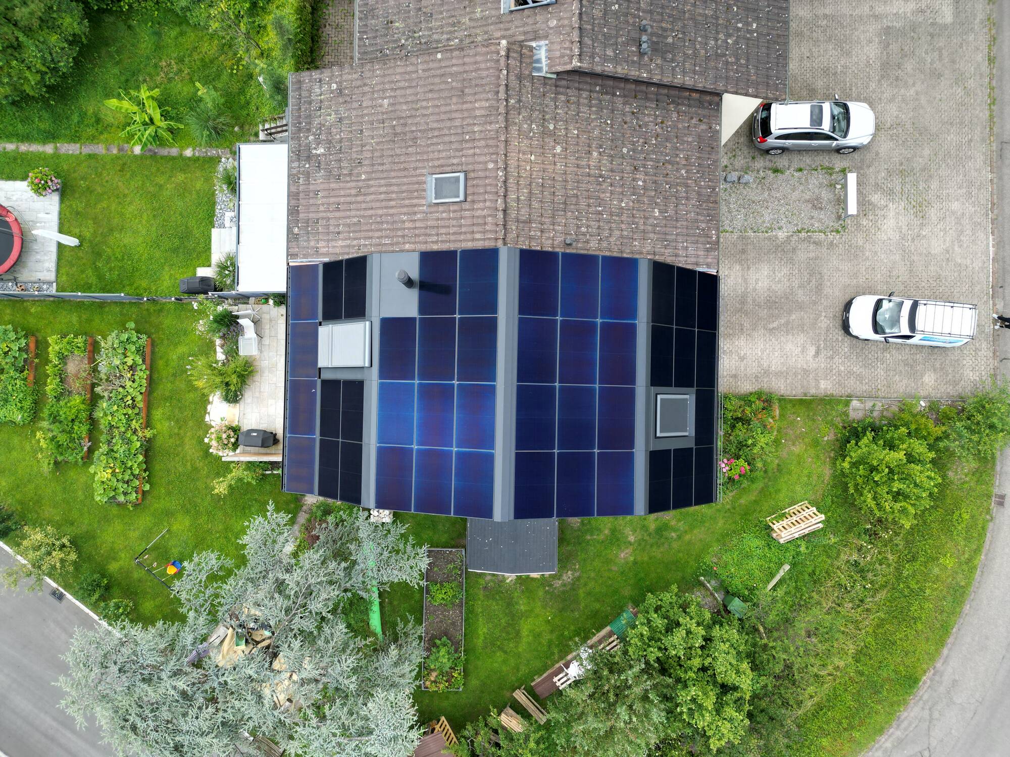 L'installation exploite quatre orientations de toiture différentes, ce qui a nécessité une conception précise du système. Deux onduleurs, équipés chacun de deux trackers MPP, assurent une production d'énergie optimale tout au long de la journée. Le système est complété par un accumulateur de 15 kW qui permet un taux d'autoconsommation élevé, notamment pendant les mois d'été, pouvant aller jusqu'à une autonomie temporaire.